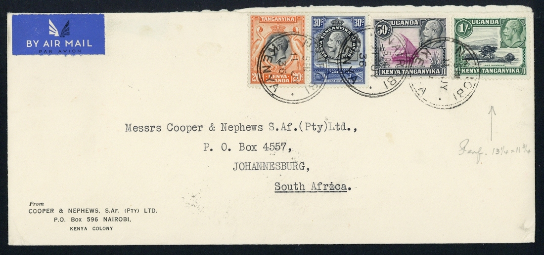 1935-37 perf. 13x12 1/- black and green used with 20c., 30c. and 50c. on 1936 (11 July) commercial envelope from Nairobi to South Africa. A scarce stamp on cover, particularly commercially used. S.G. 118a