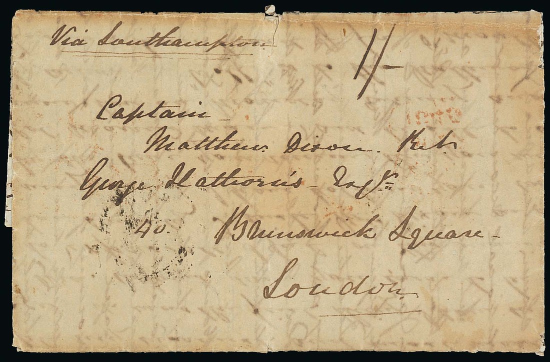 1845 lengthy entire letter from Lt. J.A. Gordon headed "H.M.Sloop Espiegle, Off the coast of Borneo, August 19th 1845", addressed to London and posted at Hong Kong on 29th September, rated "1/-" and showing, on reverse, Hong Kong and London (25.11) datestamps; a little discoloured and with some split panels. The letter gives details of the ship's position and of the charts of the area, the state of the ship and the crew, and much more. Fascinating. Photo