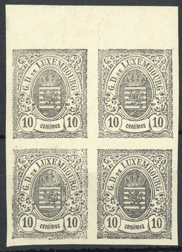 1859 Arms 10c. imperforate essay in black, block of four from the top of the sheet, with gum (hinged in margin only), fine