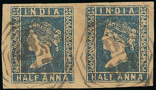 India 1854 ½a. Die I pair with good to large margins, both clearly cancelled "B/147"; a little toned though a rare multiple. S.G. Z20, £1,600. Photo