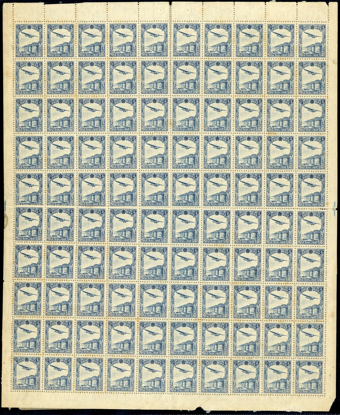 1936-37 39f. blue in a complete sheet of one hundred, unused; backing paper affixed to the reverse, some split perforations and a few age faults. S.G. 98