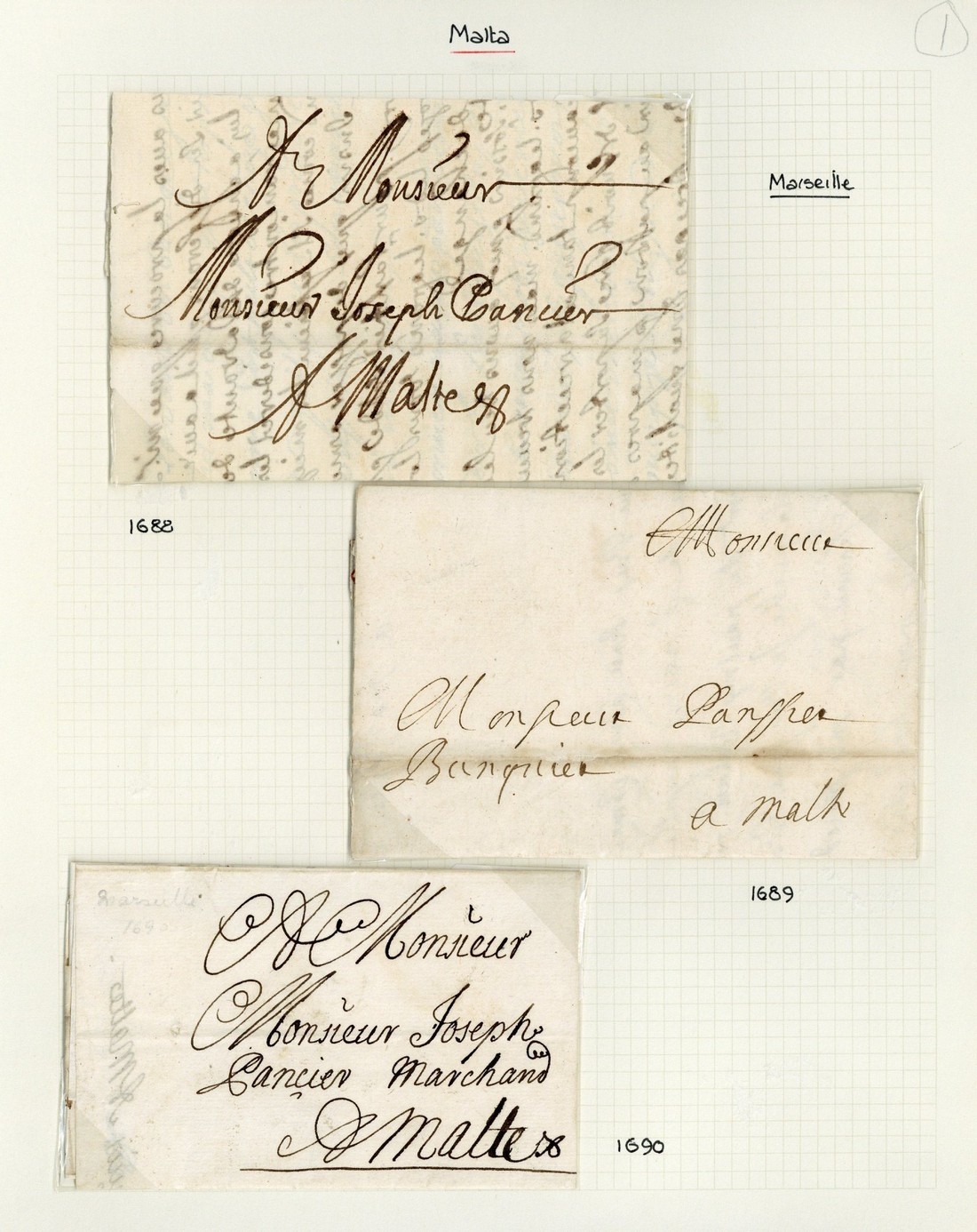 1688, 1689, 1690 (4) and 1698 entire letters from Marseilles, 1691 entire letters (2) from Toulouse, 1693, 1694, 1698 (3), 1707 and 1708 entire letters from Lyon, 1700 entire letters (2) from Paris, and 1702 and 1705 entire letters from Messina, all ex the "Pancier" correspondence to Malta. A fine lot