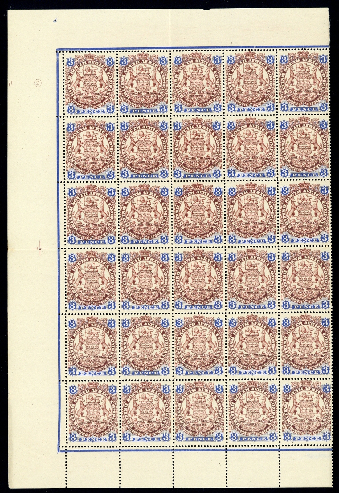 Die I 2d. yellow-brown and mauve upper left corner block of twenty-four (3x8) with plate number "2", 3d. block of thirty (5x6) from the right of the sheet with plate number "2", 3d. lower right corner block of fifteen (5x3), 1/- upper left corner block of four with plate number "1", Die II marginal or corner blocks of six, nine and eighteen, generally fine mint with most unmounted; also 2/-, 5/- and 1897 6d. used blocks of four. Cat. £2,000+