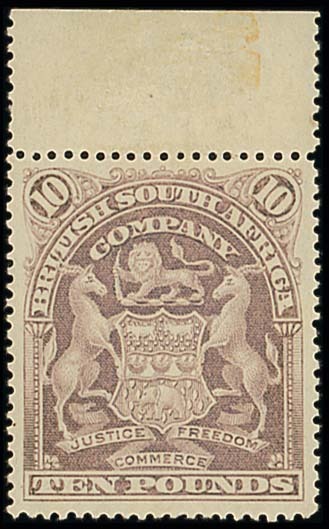 £10 lilac, marginal from the top of the sheet, mounted on face and reverse of margin, the stamp apparently unmounted though with a tiny flat spot on gum and a diagonal gum bend. R.P.S. Certificate (2009). S.G. 93, £3,500. Photo