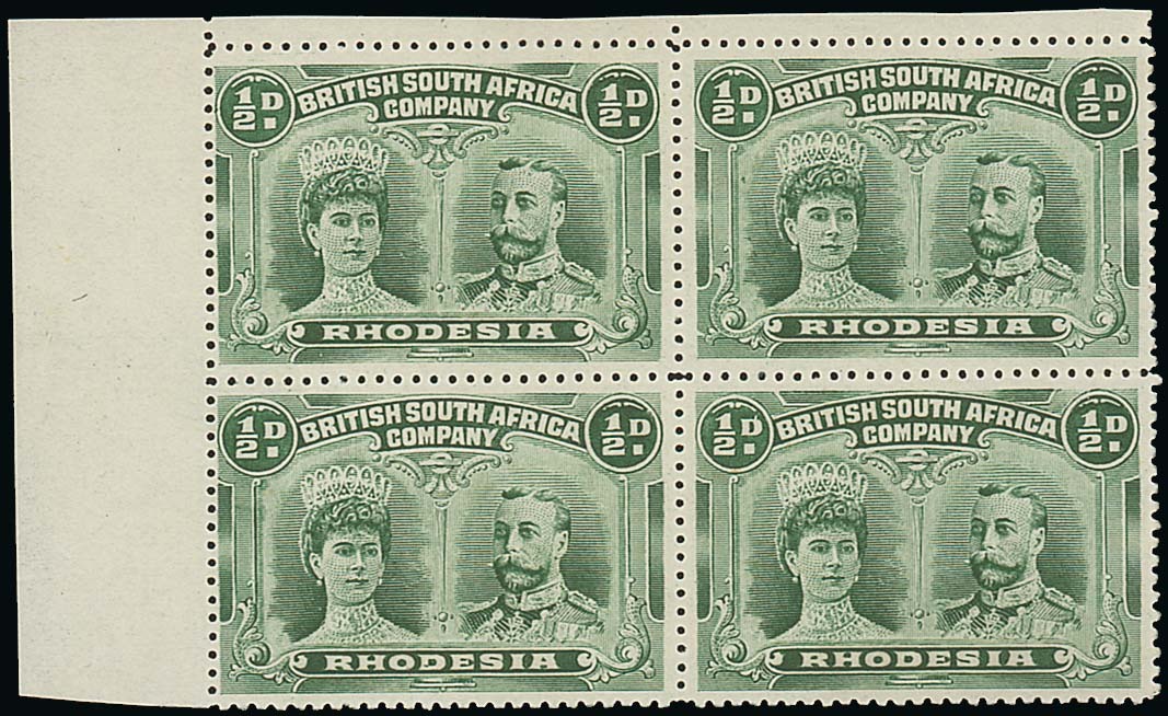 ½d. blue-green group (RJL5) upper left corner block of four, [1] and [2] with "wedge" flaws, fresh and lightly mounted mint. Photo