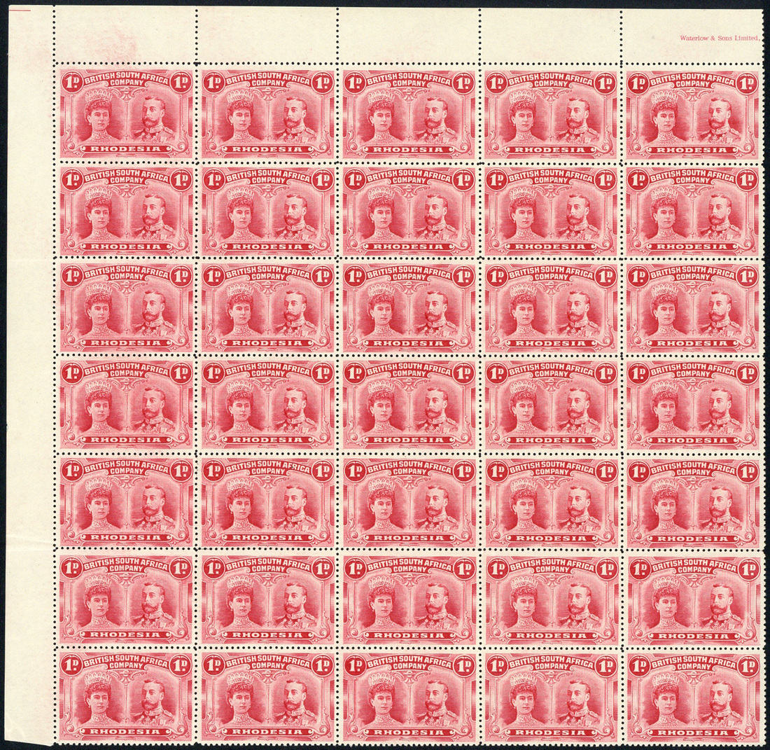 1d. bright carmine upper left corner block of thirty-five (5x7) with part imprint, unmounted mint; a couple of stamps with flat patches of gum, otherwise very fine, and a block of eight (2x4), [54-85], [74-75] with "od" flaws, patchy gum and one with a corner crease