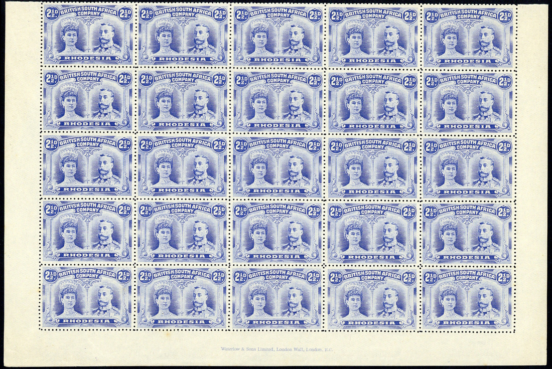 2½d. bright ultramarine complete sheet of fifty with sheet number "12", divided in to two blocks of twenty-five, and a block of twenty-five, being the top five rows of sheet number "49", mounted in margins only; top half of sheet 12 with some gum creasing, otherwise fine