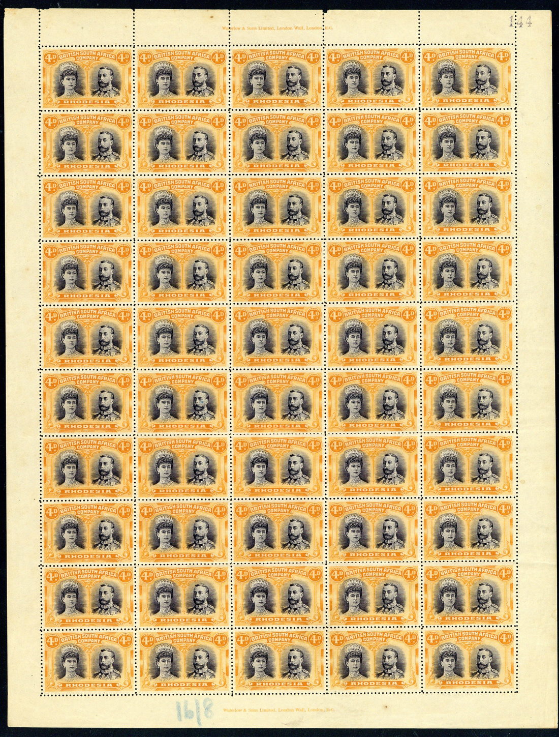 4d. greenish black and orange Long Gash printing complete sheet of fifty with sheet number "144", including [2] Long gash in Queen's ear, [25] Lines by King's cheek and [46] King's extra curl, manuscript "16/8" in blue crayon at foot indicating full sheet face value, good colour though with a large part of the gum washed off and a few separated perfs. at top. A rare multiple. S.G. 138, £7,200+