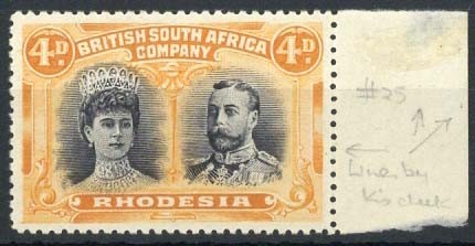 4d. black and orange, [25] Lines by King's cheek, lightly mounted mint; small thin in margin, also 5/- crimson and yellow-green, mint with some gum redistribution. S.G. 140, 160a