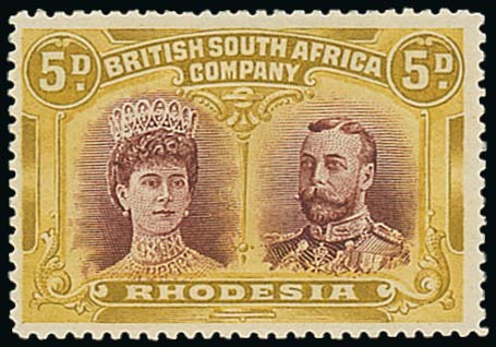 5d. error, purple-brown and ochre, good strong colours, large part original gum. An attractive example of this scarce stamp. S.G. 141ab, £650. Photo