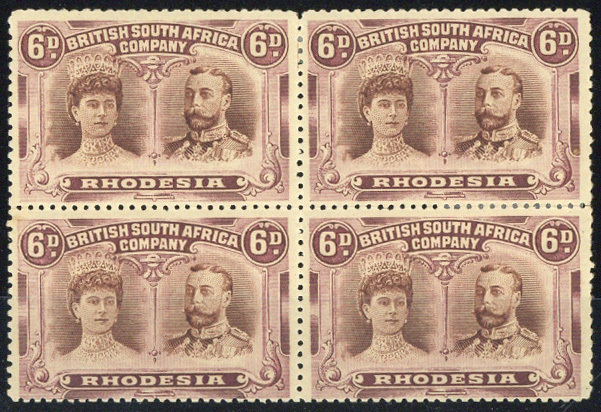 6d. brown and purple block of four, [42-48], large part original gum; largely separated between the upper and lower pairs, otherwise sound. S.G. 145
