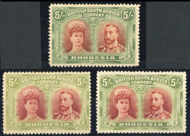 5/- vermilion and deep green, 5/- scarlet and pale yellow-green and 5/- crimson and yellow-green, fresh colours and with part to large part original gum. An attractive trio of the S.G. listed stamps. S.G. 159, 160, 160a, £975
