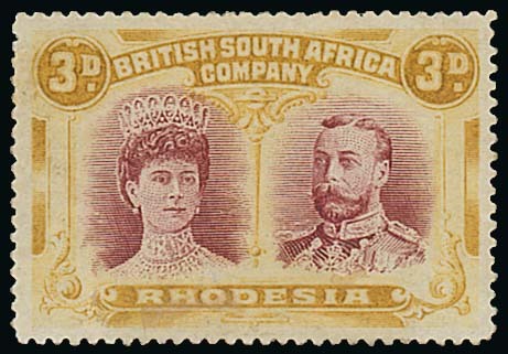 3d. claret and pale yellow-olive, unused with small part original gum; traces of another stamps design covering part of reverse though of fine appearance. A rare stamp. S.G. 173a, £3,750. Photo