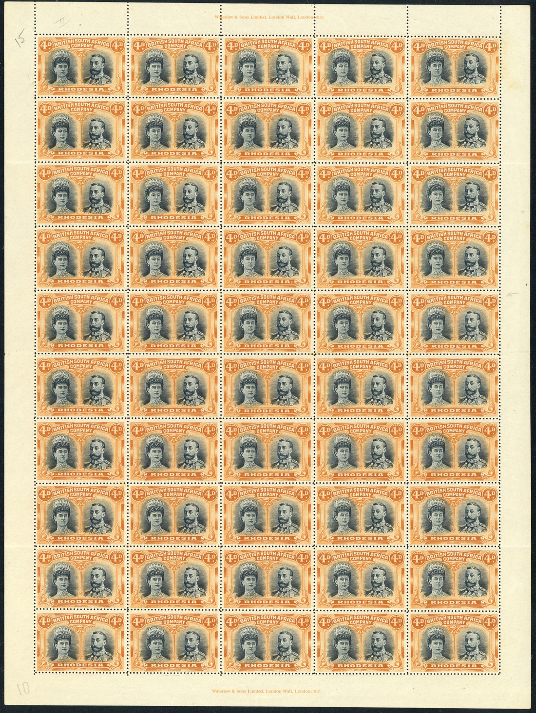 4d. black and orange Hook printing RSC "C" complete sheet of fifty, [2] with Hook in ear, [5], [10], [20], [25], [30] and [40] with medal cuts, [15] medal cuts and King's eyebrow line, [42] with printer's mark at upper right, good colours and fresh unmounted mint; perforations split between the stamps of rows 5 and 6. A scarce multiple. S.G. 174