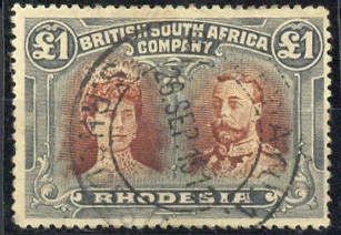 £1 red and black, neatly cancelled by nearly complete Bulawayo double-ring datestamp for 26 September 1912; a little faded, trace of soiling and a short perf. at left. Rare. Brandon Certificate (1996). S.G. 179, £3,250