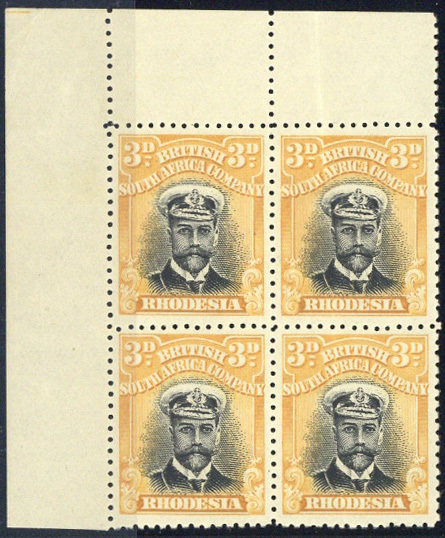 Perf. 14 3d. black and yellow upper left corner block of four, fresh mint; right-hand vertical pair with a crease, fine appearance and a scarce multiple. S.G. 210, £340+