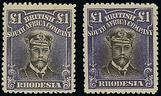£1 black and violet-indigo and £1 black and deep violet, both Die IIIA "white shoulder", part and large part original gum respectively; the latter with gum a little off-white and with a diagonal crease though of fine appearance. S.G. 279a, 279b, £1,350. Photo