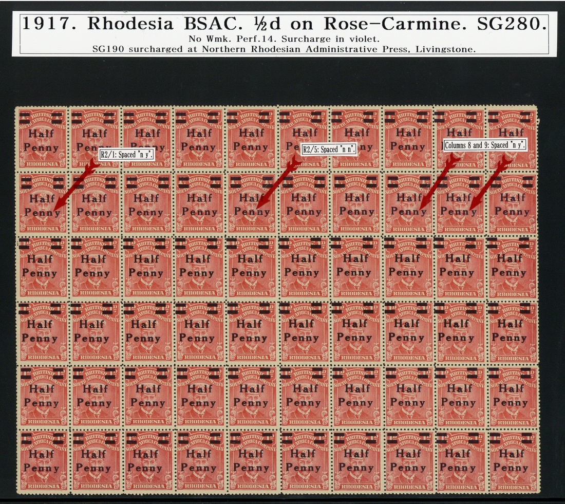 "Half/Penny" on 1d. rose-carmine pane of sixty including varieties "n n" and "n y" (3) spaced, and "Half-/Penny." pane of sixty, block of six, pairs (2) and singles (2), good to fine mint with the two panes remaining unmounted. S.G. 280, 281