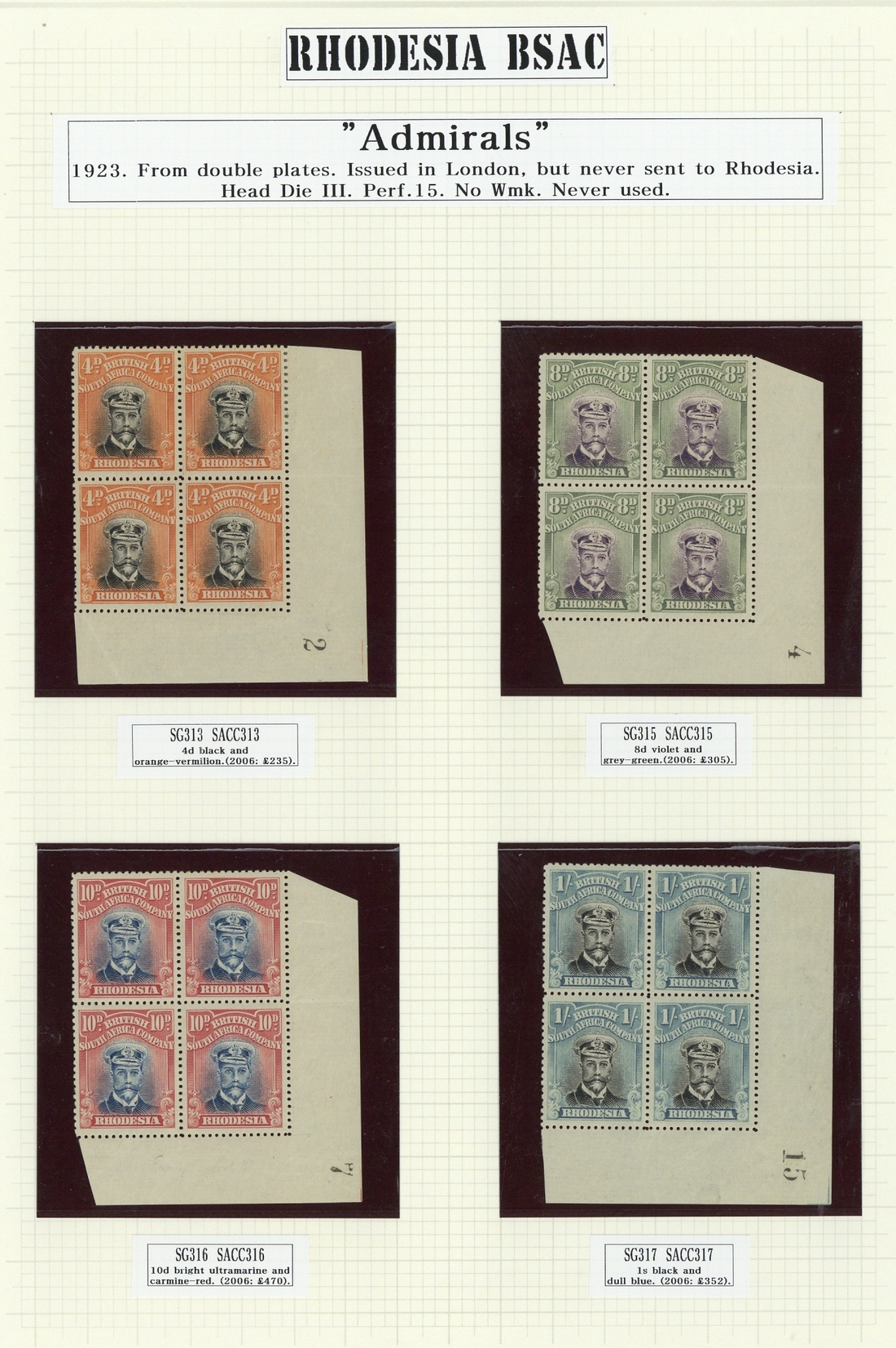 4d., 8d., 10d. and 1/- lower right corner blocks of four with sheet numbers "2", "4", "7" and "15" respectively, fine mint. A rare quartet. Cat. £1,240+