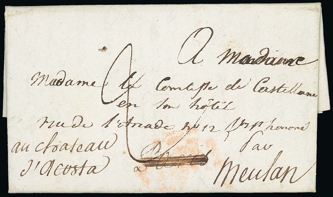 1812 (1 Oct.) entire letter from Moscow to Paris, redirected to Meulan, written by Captaine De Castellane to his father, rated "2", interesting contents (transcript included); fine. A rare letter from the Grande Armee. Photo