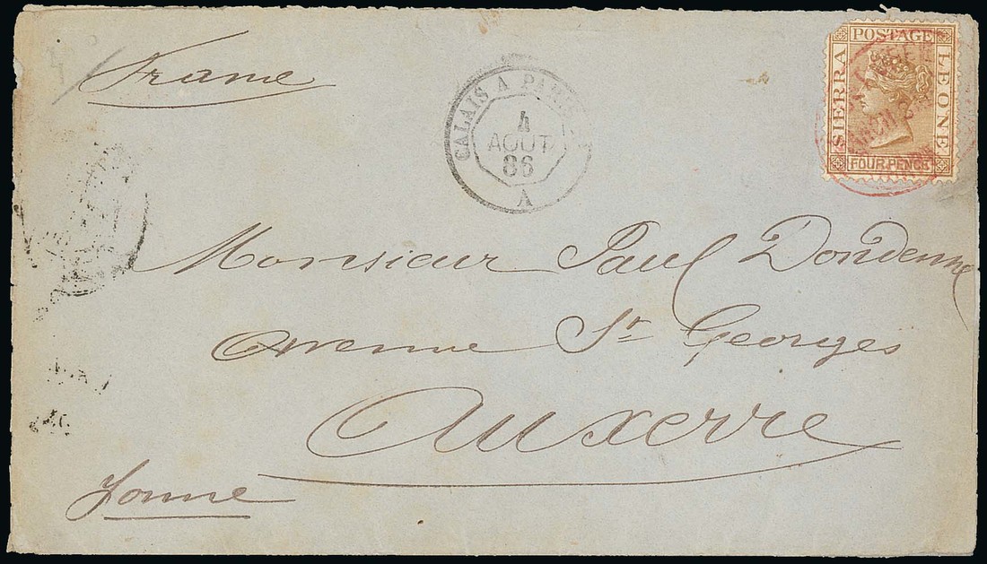 1886 (5 July) envelope (opened-out) from Manoh Salijah to France, bearing 1884-91 4d. brown (defective at upper left) cancelled with a legible strike of the "post office/manoh salijah/post office" oval-framed handstamp in red and with Calais-Paris T.P.O. c.d.s. (4.8) at left, the reverse with a superb strike of the oval handstamp, "manoh salijah/sierra leone" c.d.s. in red, Sierra Leone (12.7), London (4.8) and Auxerre (5.8) c.d.s.; minor perimeter faults with small tear affecting the oval handstamp on reverse, nevertheless a very rare cover. S.G. 33. Photo
