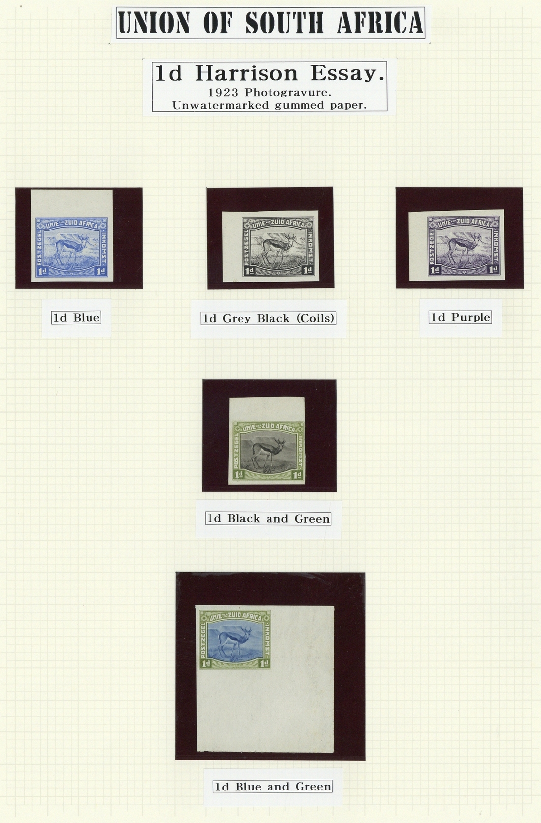 1923 Harrison 1d. Springbok Essays, five different imperforate singles, perforated in red (pair) and three different bi-coloured blocks of four, with gum; a few small faults but chiefly fine