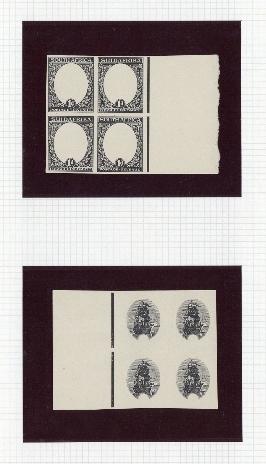 1926-54 1d. Ship mint range including 1926 frame and vignette imperforate plate proof marginal blocks of four, 1926 marginal block of twelve grossly misperforated, Darmstadt trial block of twelve on Trefoil watermarked paper, 1933-48 imperforate pair and a block of four, and 1943 coil range of 89 pairs in various multiples; generally fine