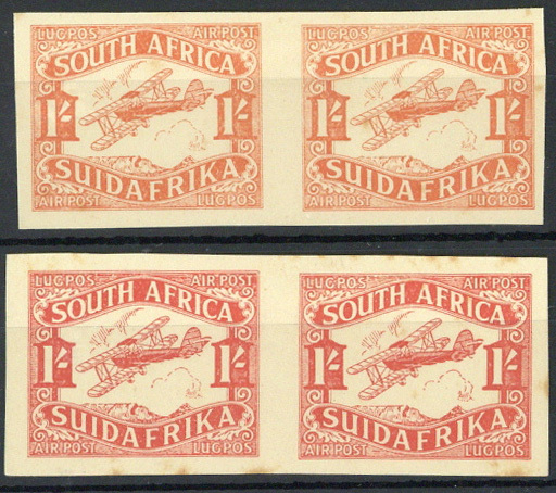 1/- imperforate colour trial horizontal pairs in orange and in scarlet, printed on the reverse of obsolete land charts, a little stained. S.G. 41P