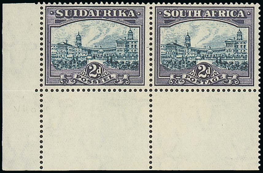 2d. blue and violet lower left corner horizontal pair, fresh unmounted mint. S.G. 44e, SACC R7,500. Photo