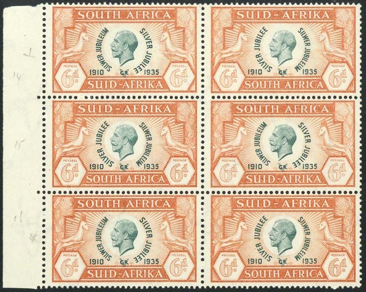 1935 Silver Jubilee set of four in marginal blocks of six from the left of the sheet, all showing cleft skull and tagged ear flaws, fresh mint with only the top pair in each mounted. S.G. 65/a-68/a