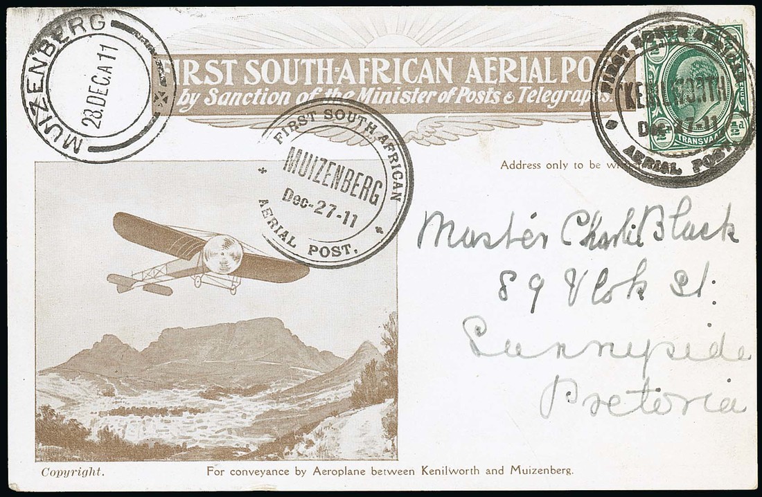 First Flight Kenilworth-Muizenberg: Souvenir card franked Transvaal ½d., to Pretoria, Kenilworth special cancellation (27.12), alongside Muizenberg special datestamp (27.12) and c.d.s. (28.12); fine and scarce. Photo