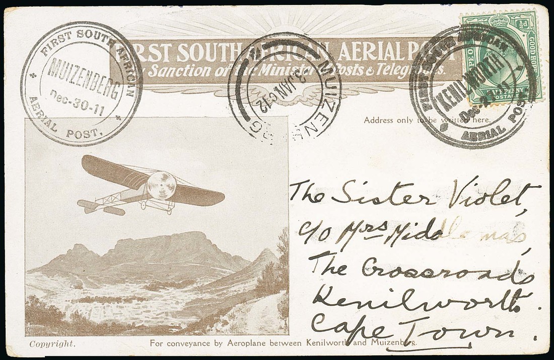 Second return flight Muizenberg-Kenilworth: Souvenir card to Cape Town, franked Cape of Good Hope ½d. with Kenilworth (27.12) special cancellation, alongside Muizenberg (30.12) special datestamp and Muizenberg (3.1) c.d.s.; fine. Photo
