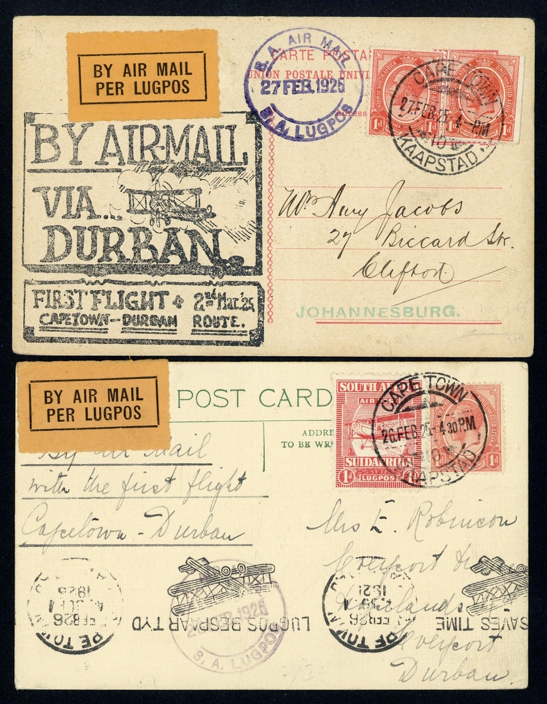 (2 March) Cape Town to Durban, four cards and a cover, Cape Town to Aliwal North card, Mosselbay to Durban card, East London to Durban card, East London to Nylstroom card, also cover registered from Great Britain to Natal carried on the Cape Town to Durban stage, good to fine (10 covers and cards)