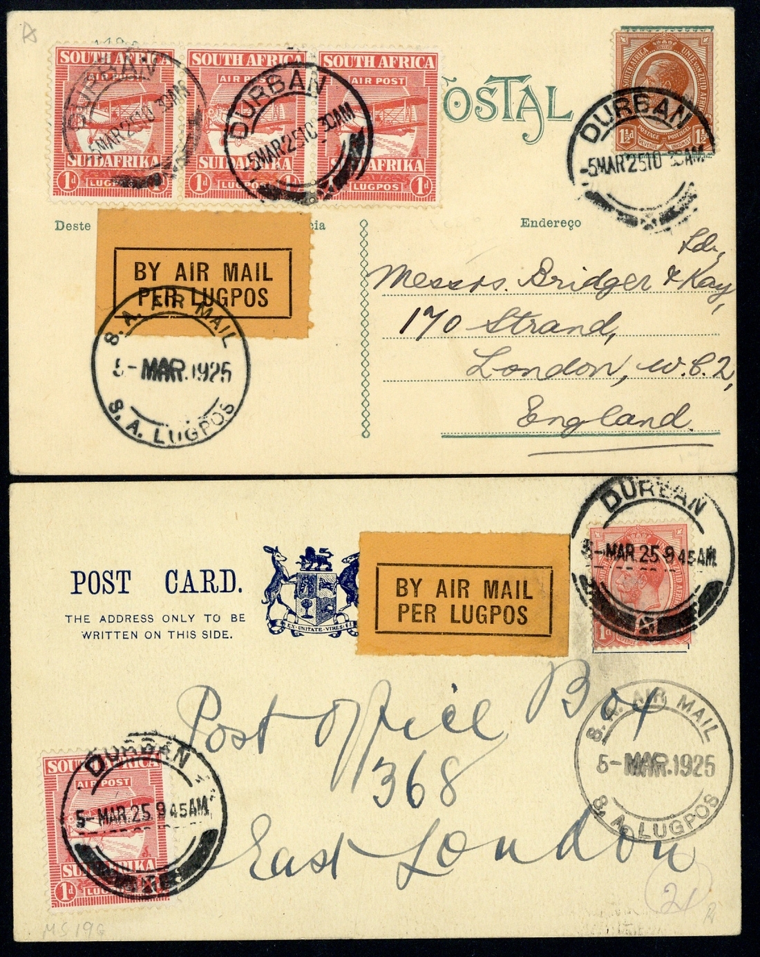 (5 March) Durban to Cape Town, card franked 1½d. and Air Mail 1d. (3), Durban to East London 1d. card additionally franked Air 1d., Durban to East London card franked 1d. and Air 1d., (9 March) Cape Town to Durban long envelope registered to Natal franked 6d., Air set of four, Mosselbay to East London card franked 1d., Air 1d.; good to fine