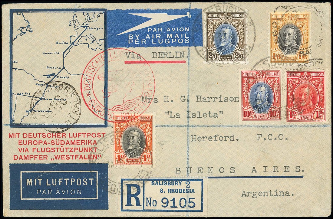 1935 (13 Apr.) "Westfalen" catapult mail illustrated envelope registered from Salisbury to Buenos Aires, franked at 5/3d. and showing "europa-sudamerika" illustrated cachet, the reverse (flap faults) with despatch, Berlin (20.4) and arrival (24.4) c.d.s.; fine and an elusive item of catapult mail originating in Southern Rhodesia. Photo