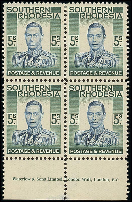 1937 (25 Nov.) ½d. to 5/- set of thirteen in marginal interpanneau blocks of eight (½d., 1d. and 1½d.) or four with full imprint, fine mint. A rare set usually lacking the ½d., 1d. and 1½d. values. Photo for 5/-