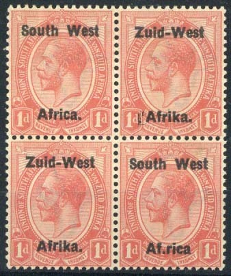 1923 (Jan.-June) Setting I 1d. block of four, the lower right stamp variety "Af.rica", unmounted mint; one normal with a light gum crease. S.G. 2/c, £180+