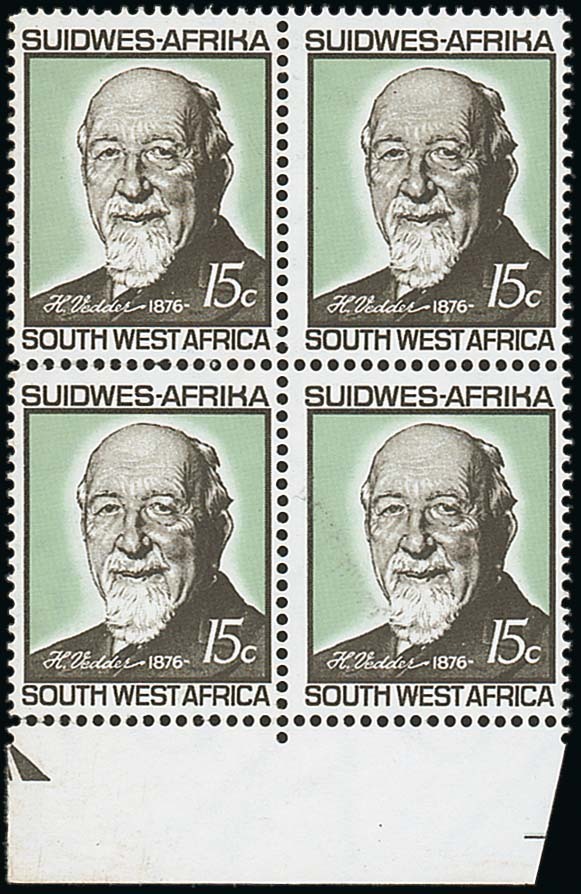 1966 (July) Dr. Vedder 3c. and 15c. colour trails in close to issued colours, both in marginal block of four from the foot of the sheet with part "arrow", fine unmounted mint. SACC R9,600+
