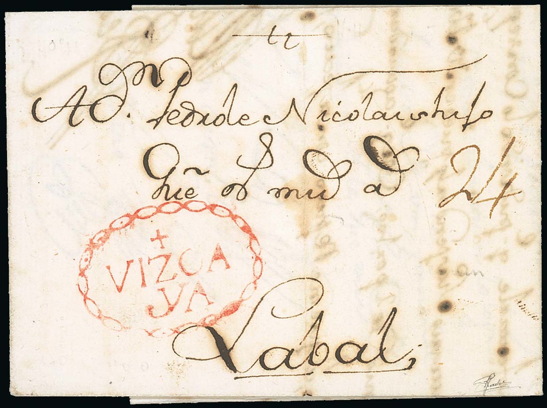 1761 (Jan. 1) entire letter to Laval, France with superb red "+/vizca/ya" in decorated oval, manuscript 24 (sols) rate marking; fine and most attractive. J. Van der Linden Certificate (2003). Photo
