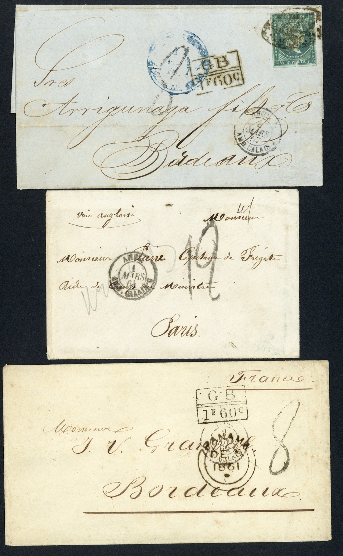 1856 (3 Dec.) entire letter from Cienfuegos to Bordeaux, franked ½r. (faults) with framed "GB/1f.60c" (Salles 3040) alongside, 1861 (6 Dec.) stampless envelope from Panama to Bordeaux with framed "GB/1f/60c." (Salles 3040), also 1864 (1 March) stampless envelope to Paris, endorsed "voie anglaise" with handstamped "12"; good to fine