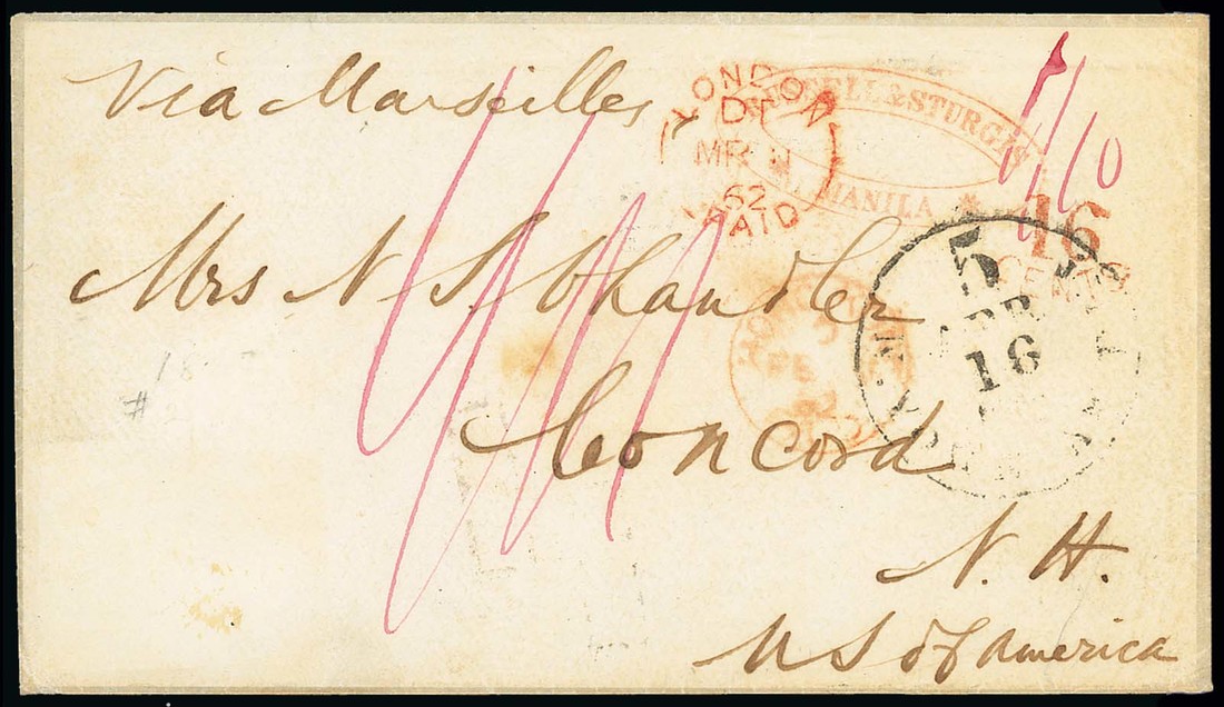 1862 (Feb.) envelope from Manila to the United States, with red Hong Kong (9.2), London (11.3), black New York (5.4) datestamps and a variety of rate markings, on reverse black Hong Kong (9.2) d.s., fine and scarce 'Two Ocean' envelope. J. Van der Linden Certificate (2011). Photo