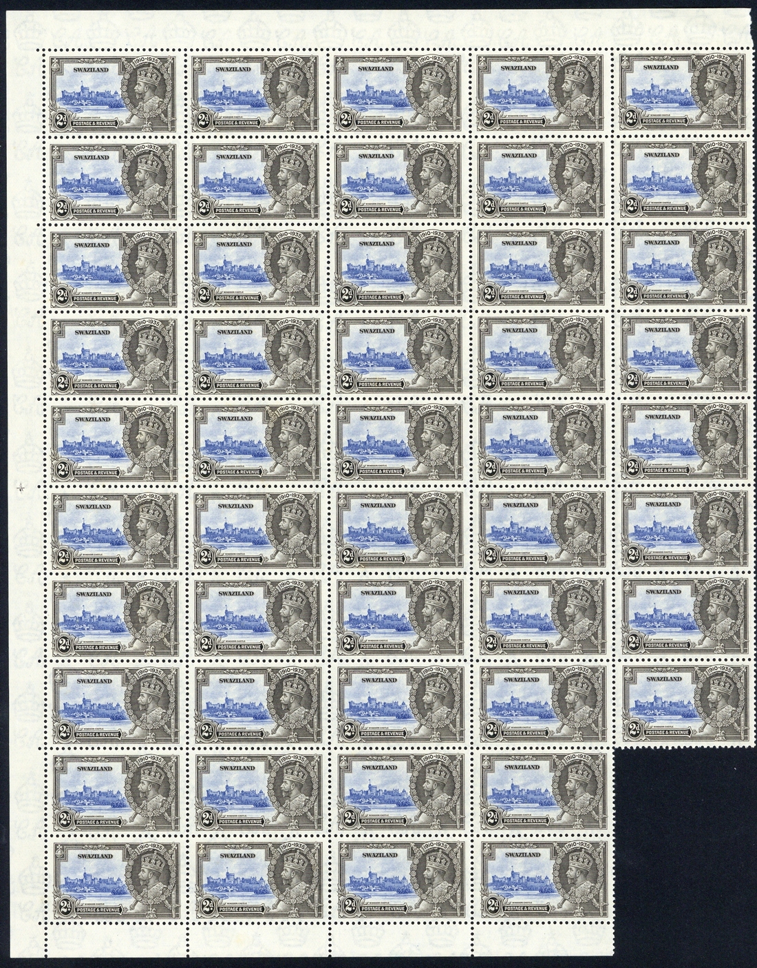 1935 Silver Jubilee 2d. large part sheet of forty-eight including lightning conductor variety, unmounted mint. S.G. 22, 22c, £255+