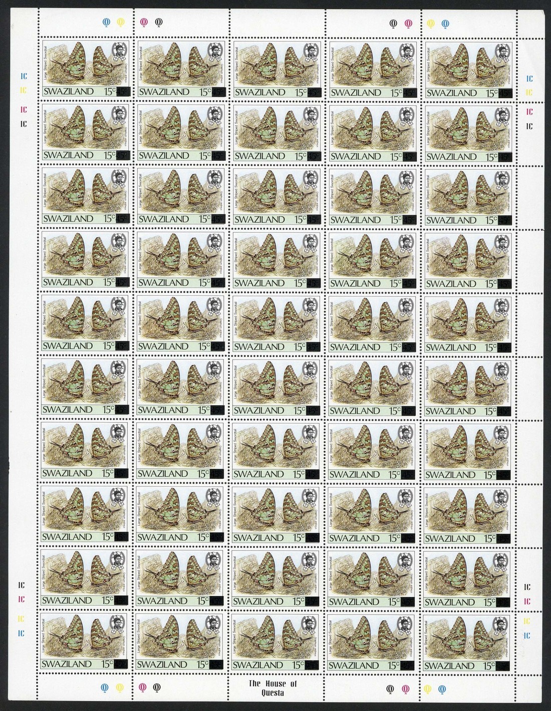 1990 15c. on 45c. Butterfly Plate 1A, 1B and 1C complete sheets of fifty, fine unmounted mint. S.G. 580a, £2,550+