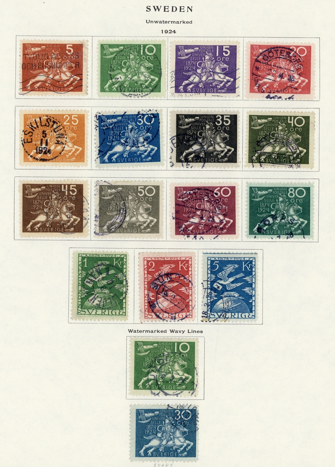 1855-1986 a predominantly used collection on pages, many hundreds, including 1855-58 6s. (also 8s. and 24s. reperforated), 1856-62 Stockholm local 1sk. and 3ö, 1858-72 9ö (2), 24ö (3), 30ö (2) and 50ö (3), 1872-79 perf. 14 4ö, 1r., perf. 13 1r., 1889 10ö on 24ö, 1903 G.P.O. 5k., 1921 Vasa set, 1924 U.P.U. Congress 2k., Anniversary set, a good range of later issues, a few first day covers, charities, Postage Dues, Officials, etc., chiefly good to fine