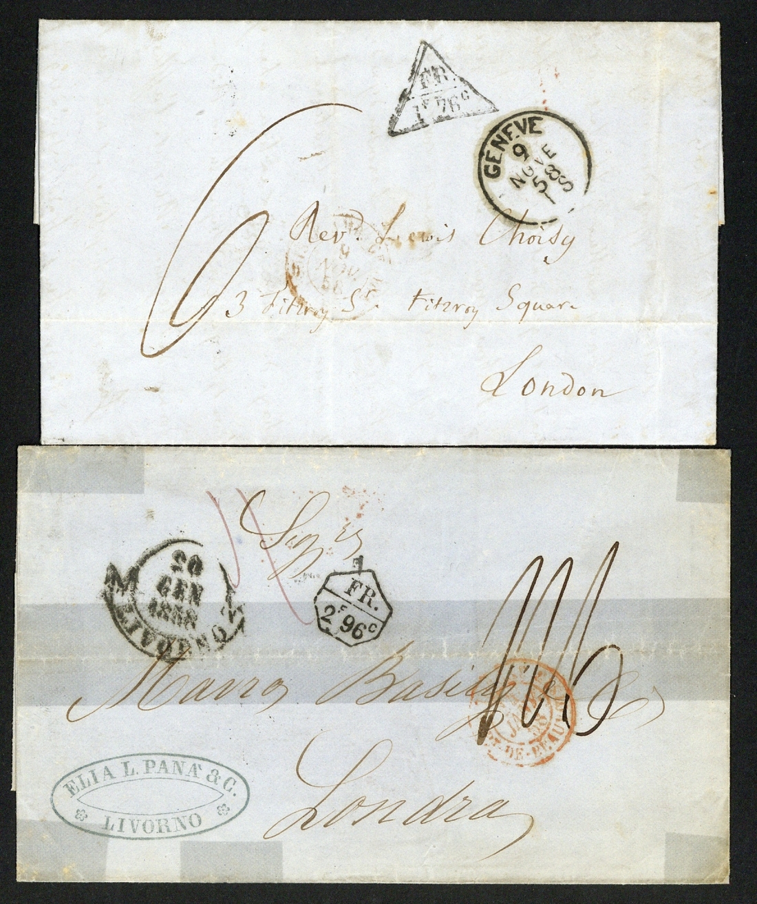 1858 (9 Nov.) stampless entire letter from Geneva to London with good "FR/1f.76c." in triangle (Salles 3089) accountancy marking, transit and arrival datestamps on reverse; filing folds and some stains, scarce. Also1858 Entire from Livorno to London with "FR/2f/96c" (Salles 3093) accountancy marking, tape stains
