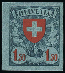 1924 Shield 1f. 50 red, blue and light blue, imperforate control print, original gum, large margins, fine and rare. Taken from a single sheet of twenty five made for checking the printing process during production. Signed Moser Räz. Photo