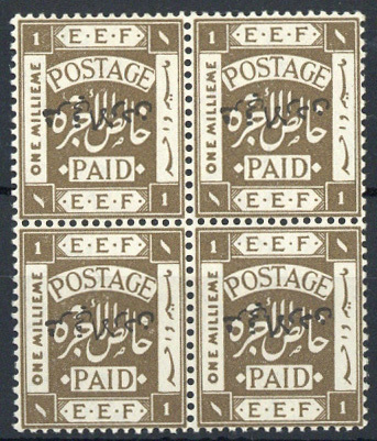 1920 perf. 15 x 14 1m. sepia, block of four with overprint inverted, unmounted mint, fine. G. Du Vachet certificate (2009) and offered with this opinion only. Not subject to return. S.G. 1a, £560+