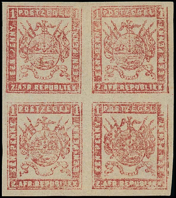 1d. carmine-red block of four with large part original gum; one stamp with small thin at hinge remnant, otherwise fresh and fine. A rare multiple. S.G. 8b. Photo
