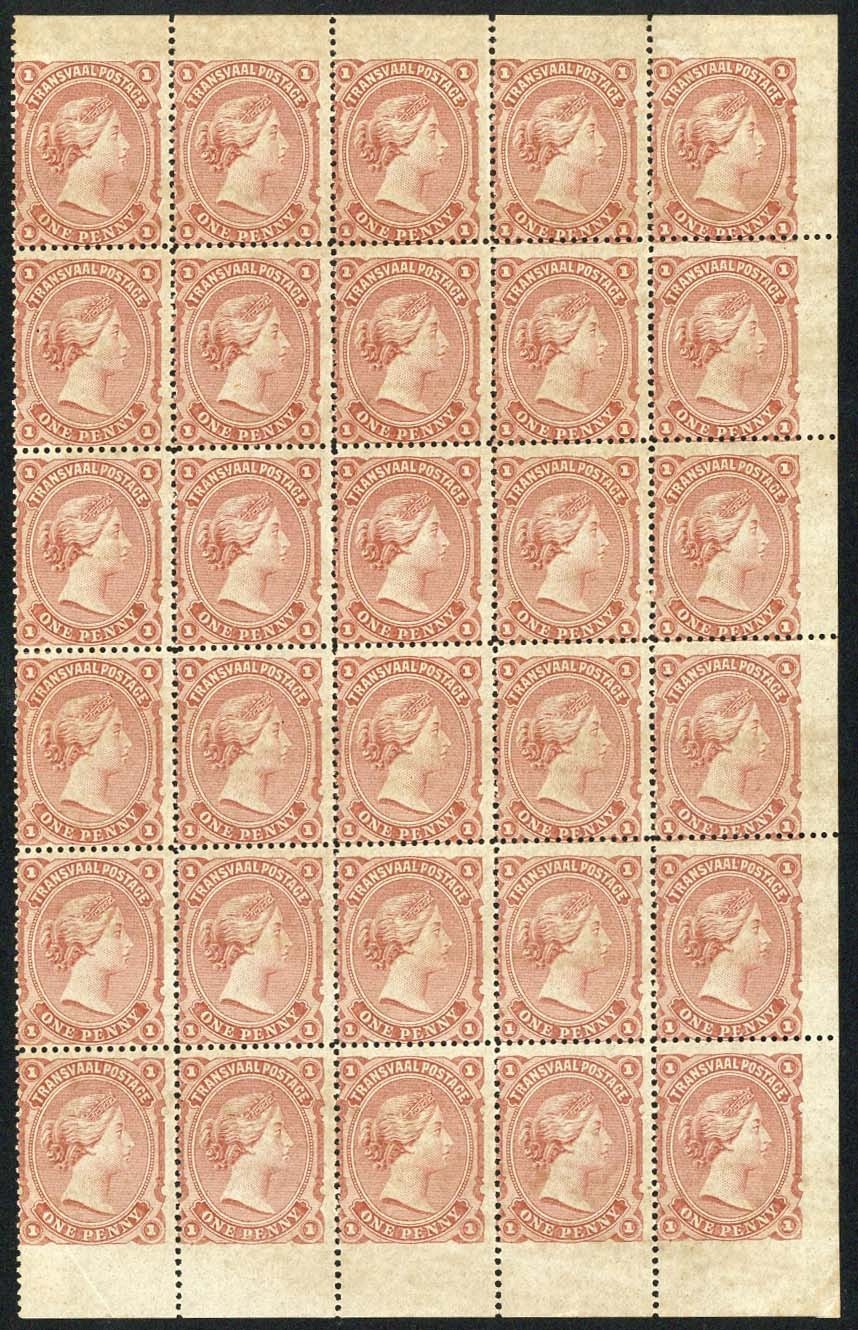 1d. pale red block of thirty from the right of the sheet with margins on three sides, fine unused with virtually full original gum. A rare multiple. S.G. 134, £600