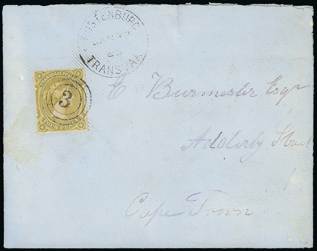 1883 (Jan.) envelope (with letter) from Rustenburg to Cape Town, bearing 1878 4d. sage-green tied by "3" three-ring obliterator, showing despatch c.d.s. alongside with Potchefstroom and arrival datestamps on reverse; the cover with small tear at top. An attractive item and a scarce stamp used alone. Photo